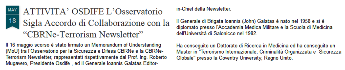 October 2014CBRNE-Terrorism Newsletter signed a MoU with University of Rome, "Tor Vergata" to provide media support and CBRNE experts for the International CBRNe Master Degree programs delivered by the Italian University (OPCW and NATO supported).